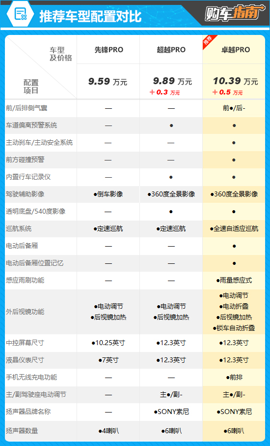通过配置对比可以看出,顶配车型卓越PRO更值得推荐。其中,超越PRO仅比先锋PRO贵0.3万元,但在主动安全和驾驶辅助影像等方面提升明显,同时智能化与影音娱乐功能也更完善,新增配置带来的价值远超差价,性价比突出。